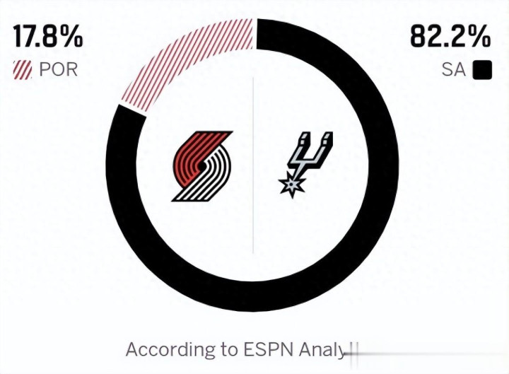 明天上午 9 点,NBA 西部首轮 G1 马刺对阵开拓者的较量将正式打响。赛前 ESPN 给出的预测呈现一边倒态势:马刺胜率高达 82.2%,开拓者仅 17.8%,悬殊差距尽显两队实力鸿沟。